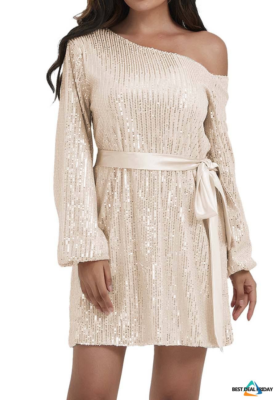 * DESIGN -- Long Sleeve, One off shoulder,sequin, glitter, elastic cuffs, velvet belt, breathable lining slim fitted, sparkle night out party tops. Cute and stylish.