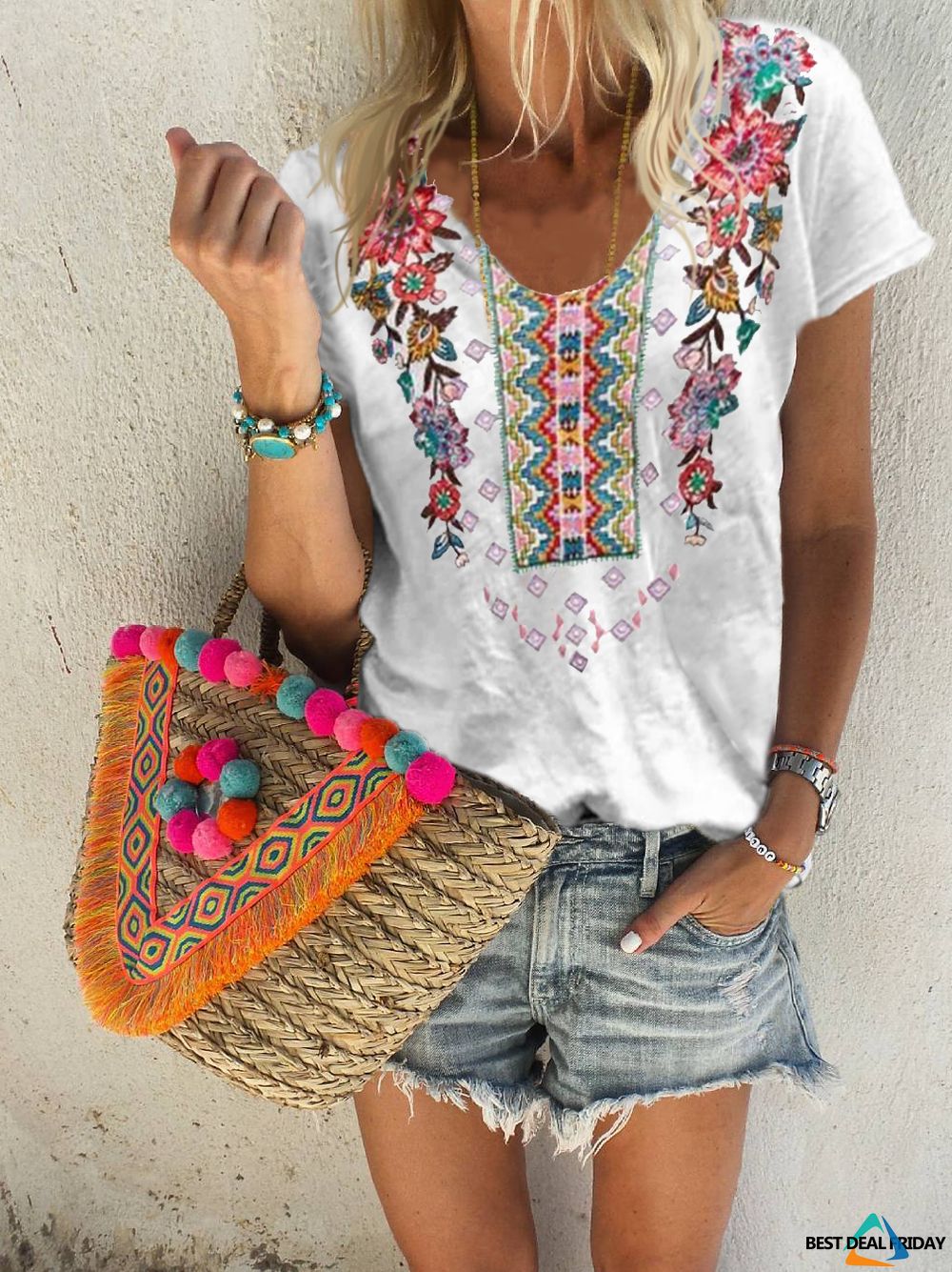 Floral Butterfly Short Sleeve V Neck Casual T Shirt P4608083672