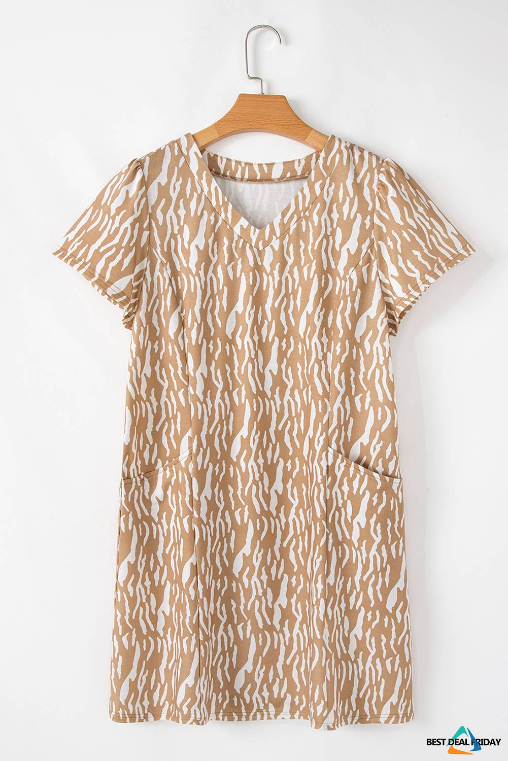 V-neck, short sleeve and a shift fit silhouette.