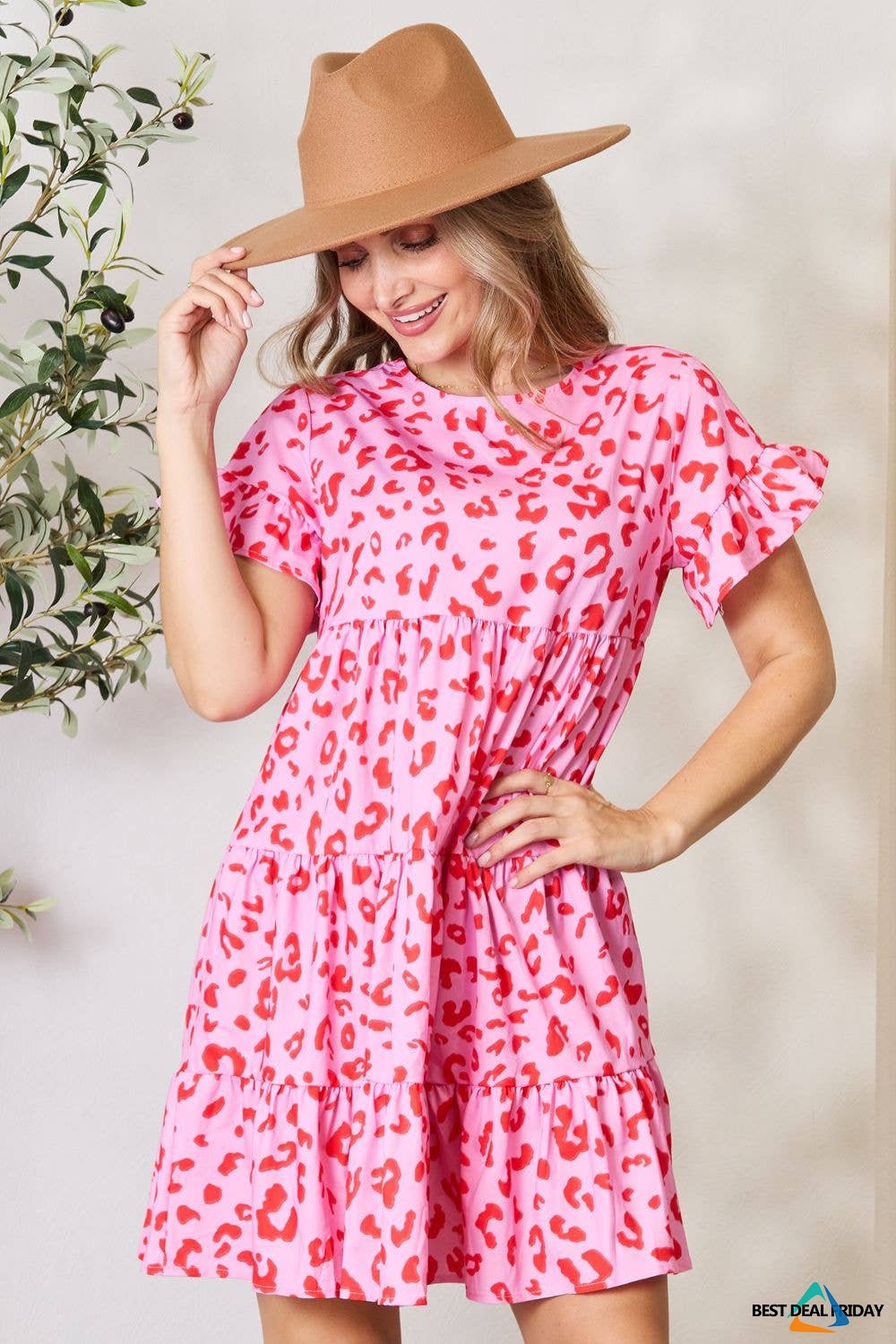 This short flounce sleeve dress features a round neck and a tiered design, creating a playful and boho-chic look. The tiered design add movement and dimension to the dress, making it a fun and fashionable choice for any occasion.