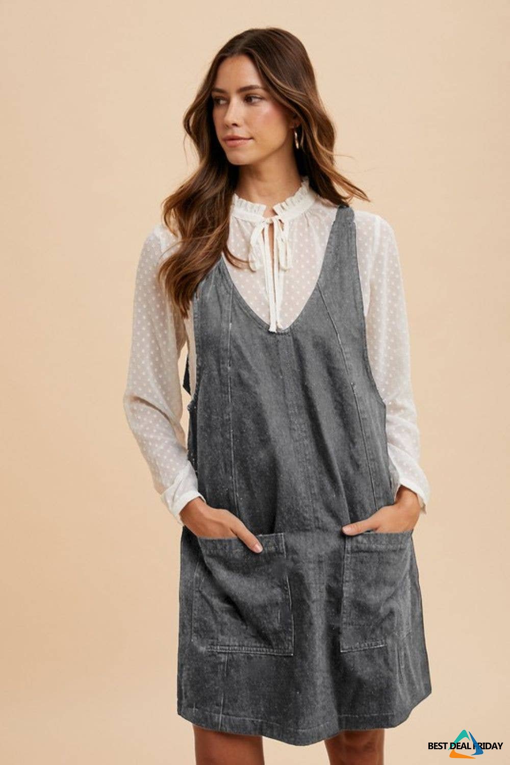 The V-Neck Adjustable Strap Denim Overall Dress with Pockets is a stylish and practical wardrobe essential. This dress features a flattering V-neckline and adjustable shoulder straps for a customized fit. The denim fabric adds a casual and trendy touch, perfect for everyday wear. The overall style gives it a fun and playful look, while the pockets provide convenience and a touch of functionality. This versatile dress can be layered over a variety of tops for different styling options, making it a versatile and fashionable choice for any occasion.