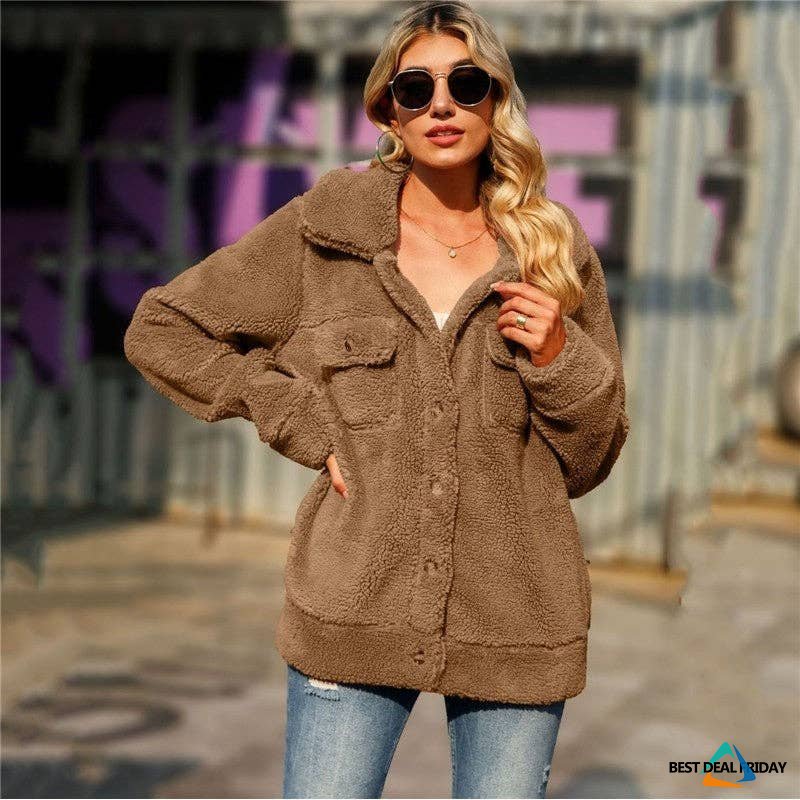 This Long Sleeve Lapel Solid Color Loose Double-Sided Cashmere Jacket is perfect for any occasion. It features a lapel collar with two open pockets at the front for added storage.