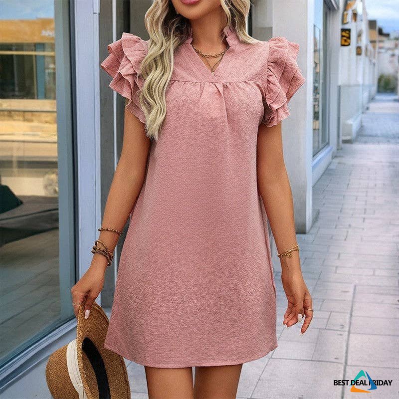 Elevate your style with this chic Stand Collar Ruffle Hem Dress. Featuring a flattering stand collar and a stylish ruffle hem, this dress is perfect for any occasion. The solid color adds a touch of elegance, making it a versatile piece for your wardrobe. Dress it up with heels for