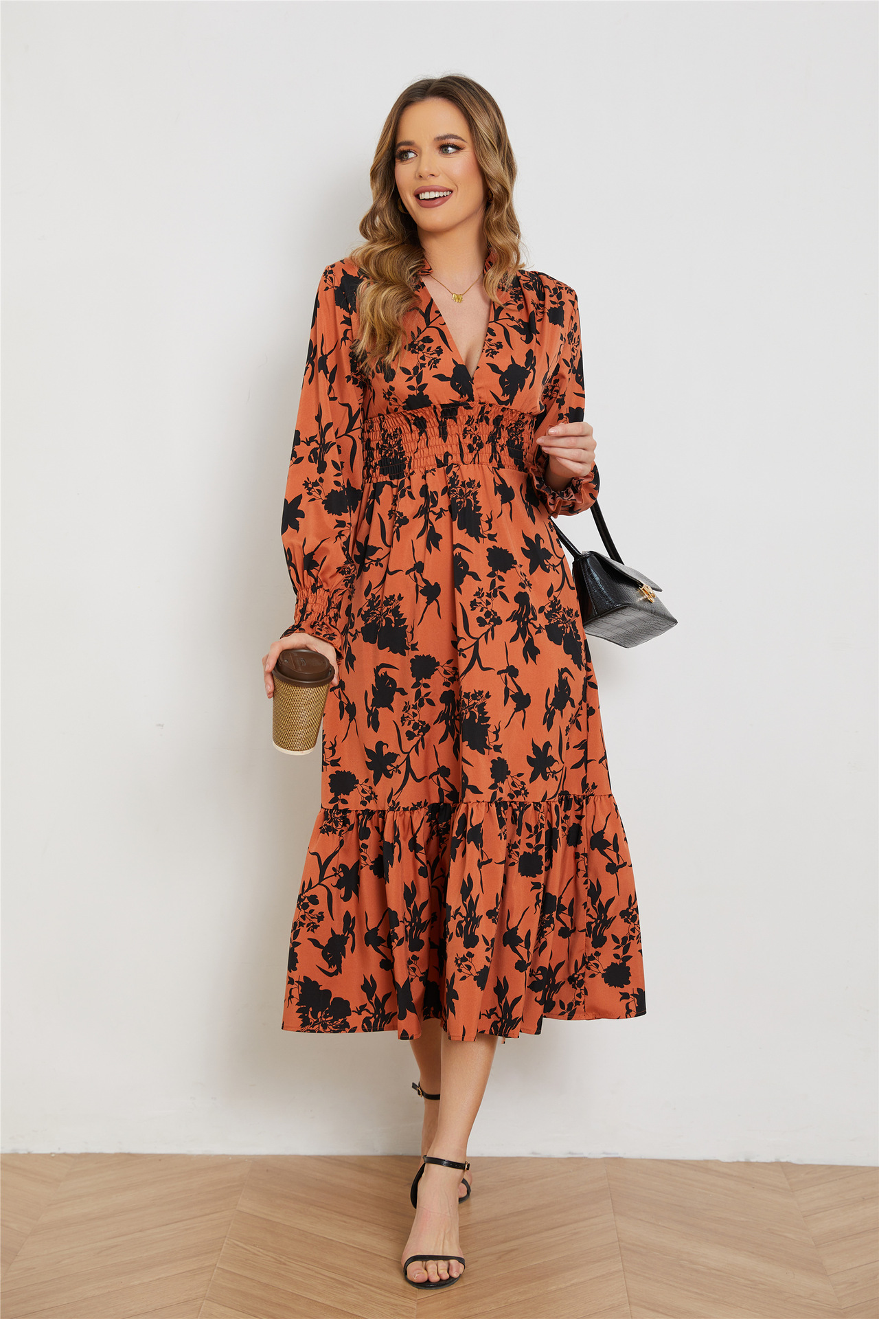 This bold maxi dress is a modern take on retro style. It features a V-neckline, long sleeves with smocked cuffs, and a smocked waist that creates a flattering fit, flowing into a tiered skirt adorned with a striking black floral print on an orange background. Crafted from a lightweight, flowy fabric, it offers both comfort and a sophisticated, head-turning look, perfect for date nights, cocktail parties, or any special occasion where you want to make a statement.