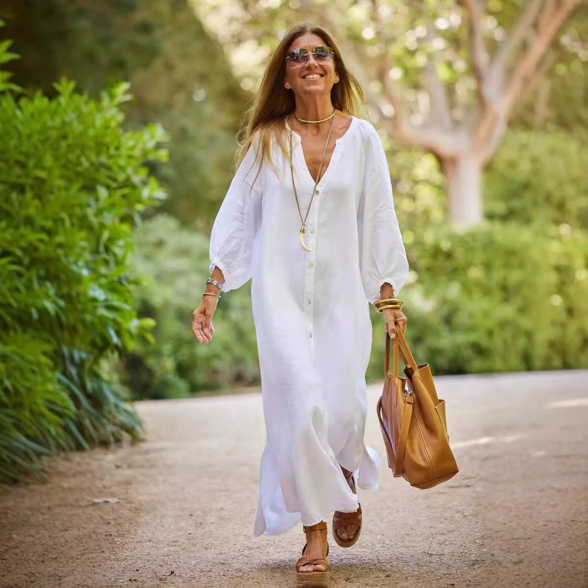 This white maxi dress is the epitome of effortless resort chic. It features a V-neckline, long balloon sleeves, and a loose, flowy silhouette with a button-front placket. Crafted from breathable linen fabric, it’s perfect for strolling through a garden, beach walks, or layering with accessories for a bohemian-inspired look.