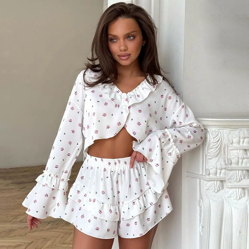 A playful pajama set on a white base with delicate pink floral prints, including a cropped button-front top with ruffled collar and cuffs, and matching ruffled shorts. The feminine details and soft fabric create a sweet, feminine look ideal for sleep or loungewear.